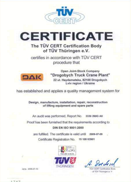 With implemented quality management system ISO 9001:2000 and possessing European certificate of conformity is so far the first and only truck cranes manufacturer on the territory of CIS countries selling its products in EU.